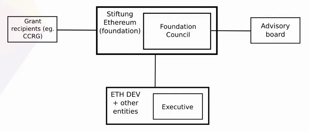直到 2015 年 4 月 10 日,以太坊基金会开始运作逐渐走上正轨,成为支持技术开发和治理决策的重要支柱。以太坊基金会开启了董事会选择,基金会最初的组织架构:瑞士和柏林的中心是最大的。