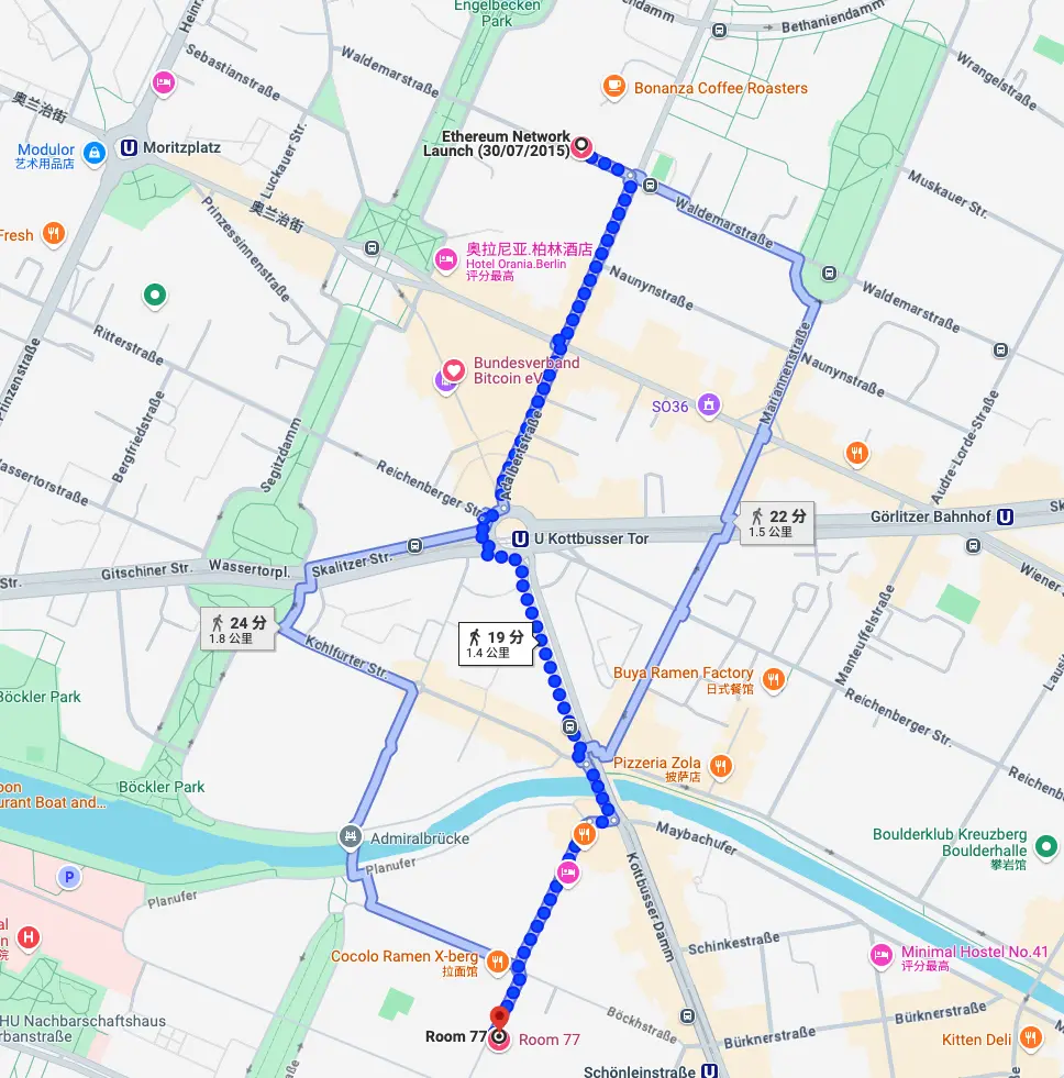 在这个区域附近,以太坊租了一个办公室,距离「Room 77」餐吧只有 1.5 公里,Vitalik 走路不出 20 分钟就能到。现在在谷歌地图搜索以太坊办公室的地址「Waldemarstraße 37A, 10999 Berlin」,还能看到这个地址被标注上了 Ethereum Network Launch (30/07/2015),以及当时以太坊核心早期成员的合影照。
