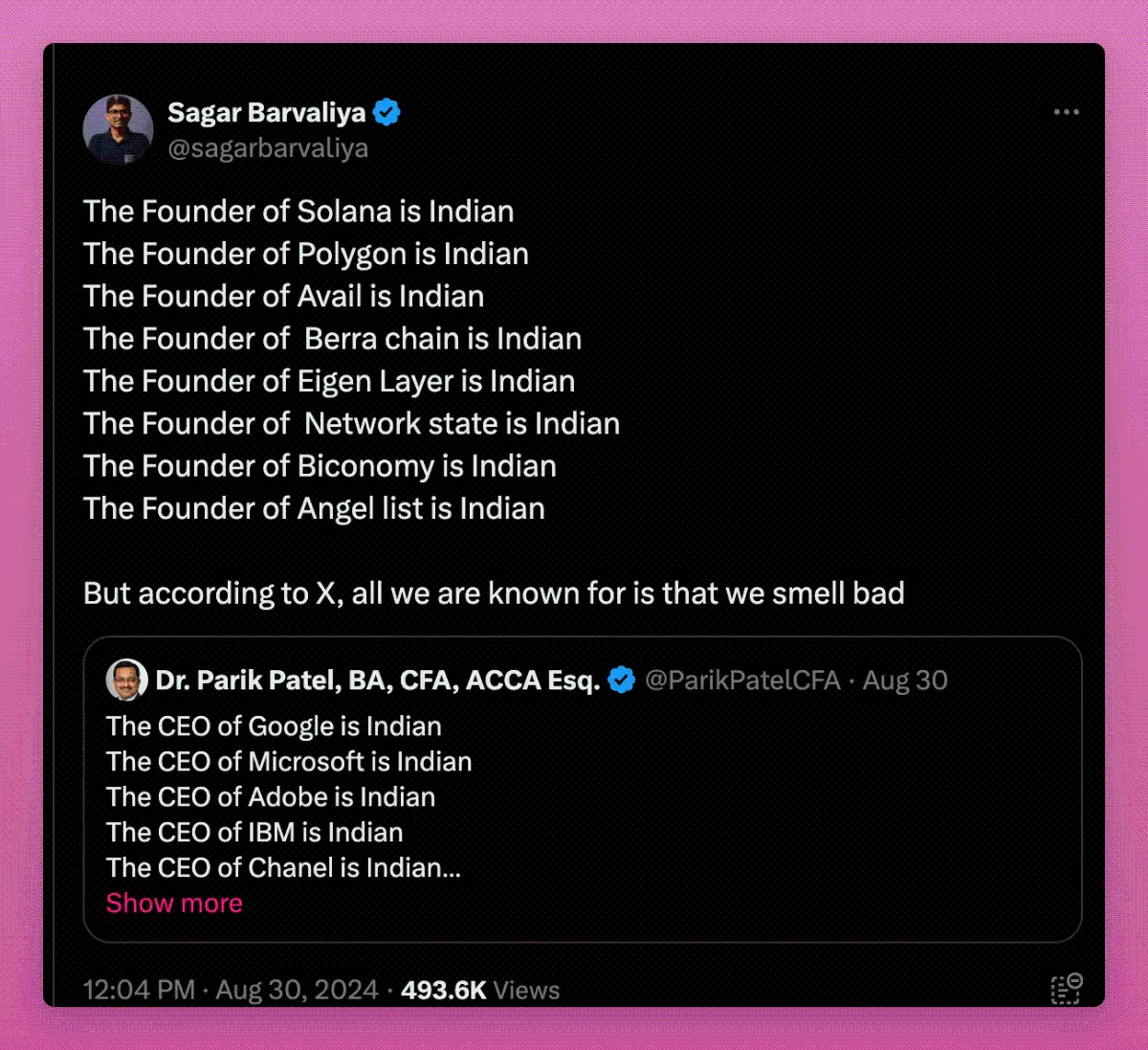 我在 X 上询问 Hitesh.eth 什么让印度独特。除了他对加密货币的独到见解,Hitesh 还在开发一个平台(DYOR),帮助人们更轻松地理解加密基础知识。印度拥有最大的失业青年群体,他们渴望为获得激励而努力。如果操作得当,应用程序可以通过代币和积分的形式引导这些激励,就像过去在 Axie 中看到的那样。在基础设施方面,印度拥有一些最优秀的开发者资源,其成本远低于欧盟和美国。