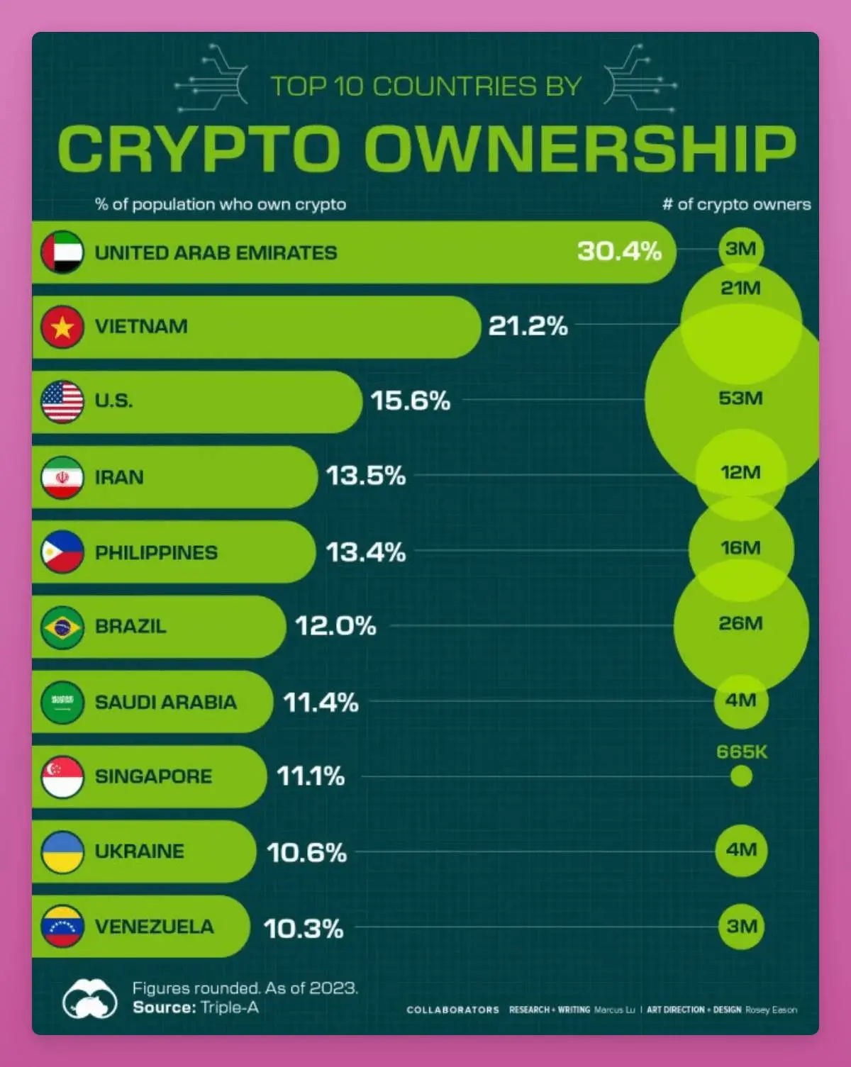 首先,我们来看看越南,这里是我们 DeFi 创作者工作室 Pink Brains 团队的大部分成员来自的地方,他们为市场提供了个人经验。根据 Triple-A 的数据,越南是加密货币拥有率第二高的国家。大约 21.2% 的人口持有加密货币,仅次于阿联酋的 34.4%。
