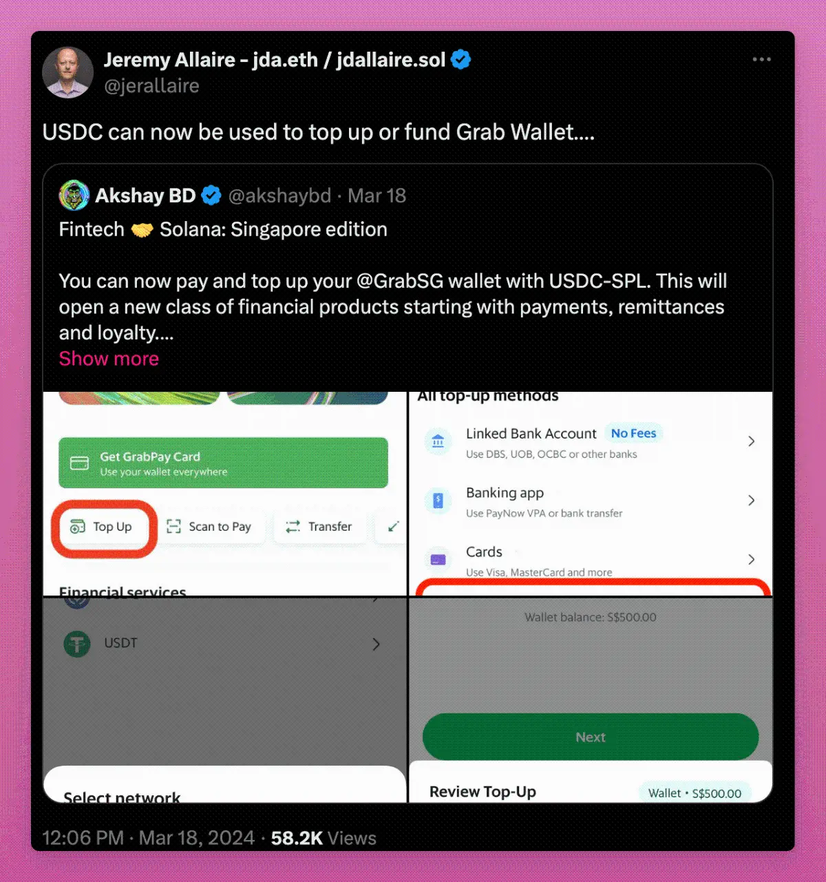 更重要的是,许多人用于打车、食品配送和其他服务的超级应用程序 Grab 开始允许用户使用加密货币为电子钱包充值。现在,用户可以使用比特币、以太坊、XSGD(新加坡本地稳定币)、Circle USD 和 Tether 付款。
