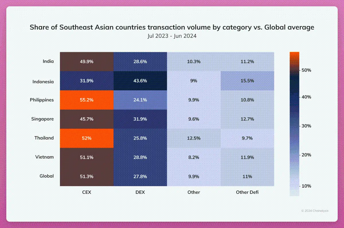 在 2024 年全球加密货币采用指数中,中南亚和大洋洲(Central & Southern Asia and Oceania)地区确实表现突出,该地区有七个国家跻身前 20 名:印度 (1)、印度尼西亚 (3)、越南 (5)、菲律宾 (8)、巴基斯坦 (9)、泰国 (16) 和柬埔寨 (17)。