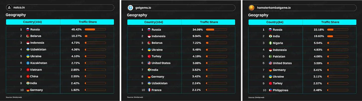 Notcoin 的网站 (notco.in) 超过 66% 的访问来自独联体国家。其次是印度尼西亚、越南、中国和印度等亚洲国家。Getgems.io 和 Hamster Kombat 显示出类似的趋势,与 Telegram 用户基础一致。