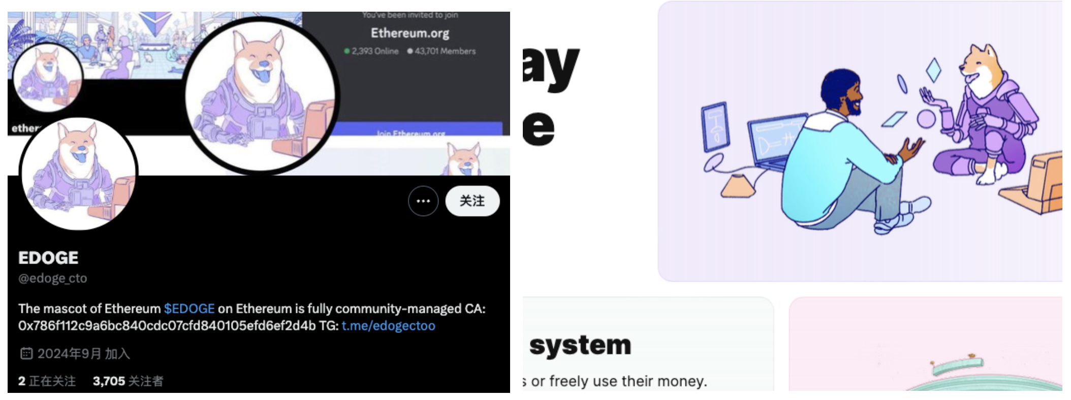 $EDOGE 概念来自以太坊官网(ethereum.org)上的一只宇航员狗狗,它在网站的各个页面中经常出现,因此被社区视为以太坊「官方网站的吉祥物」。但 @0xBit90536646 在推特上表示,$EDOGE 代币在代码层面留有卖出数量限制、最大交易额和最大持仓可改、交易税可改、可以设置白名单和黑名单等诸多后门。