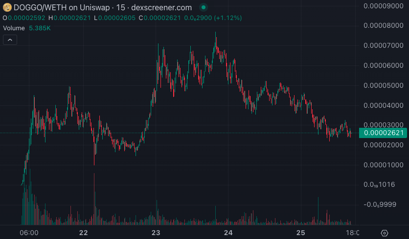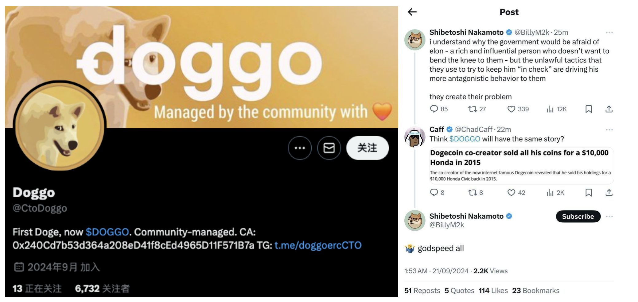 9 月 20 日,狗币创始人 Shibetoshi Nakamoto(@BillyM2k)在 X 上发了一段弱智狗的视频并附言:what happened to poor doggo?随后便有团队发行了$DOGGO 代币,并将 6.56% 的 $DOGGO 代币打给 Shibetoshi,随后 Shibetoshi 便将手中的 $DOGGO 全部卖出。「创始人卖飞」的故事让$DOGGO 立刻火爆,但在次日 Shibetoshi 否认对 $DOGGO 的背书后,该 meme 代币便一蹶不振。