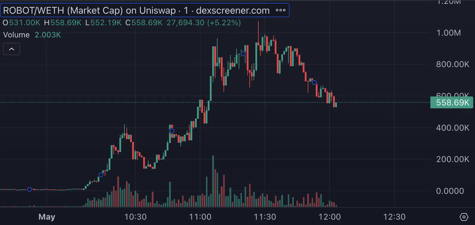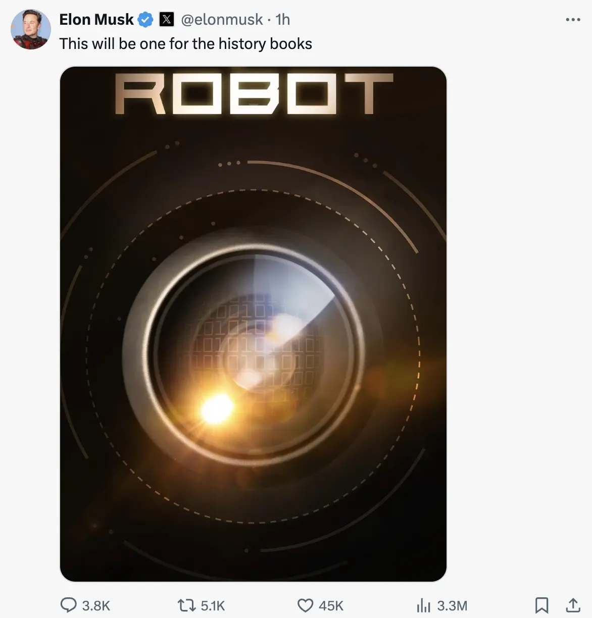 今日上午 10 时,马斯克在 X 平台发布预告称将于 10 月 10 日发布人形机器人产品,并称「这将载入史册」,海报中配文「We Robot」,随后以太坊上便出现了 ROBOT 和 WR 两个较为火热的 meme。其中,ROBOT 短时拉升近 6 倍,WR 短时亦拉升近 20 倍。还有社区成员根据对产品名称的猜测,将此前的大小写$Robotaxi、$cybercrab、$FSD 等均列入了观察列表。
