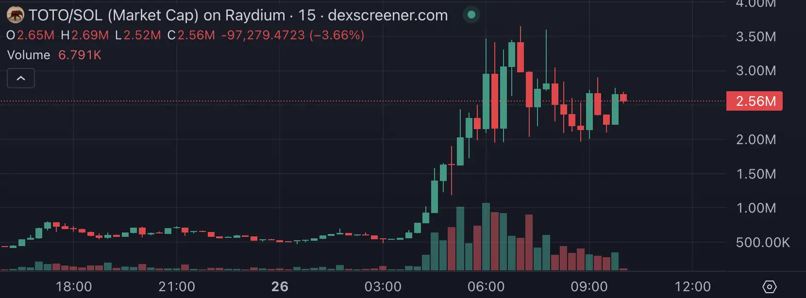 TOTO 是一只被慈善动物保护信托基金 SheldrickTrust 所救助的小象,马斯克曾在 8 月 11 日回复过 TOTO 被救助的推文,TOTO 代币上线于 19 日,市值在突破 1M 美元后持续下跌,昨日晚,TOTO 的救助组织 Sheldrick Wildlife Trust 发布了 TOTO 回顾视频,meme 社区的 TOTO 喊单也密集出现,三个小时后,TOTO 开启暴涨。
