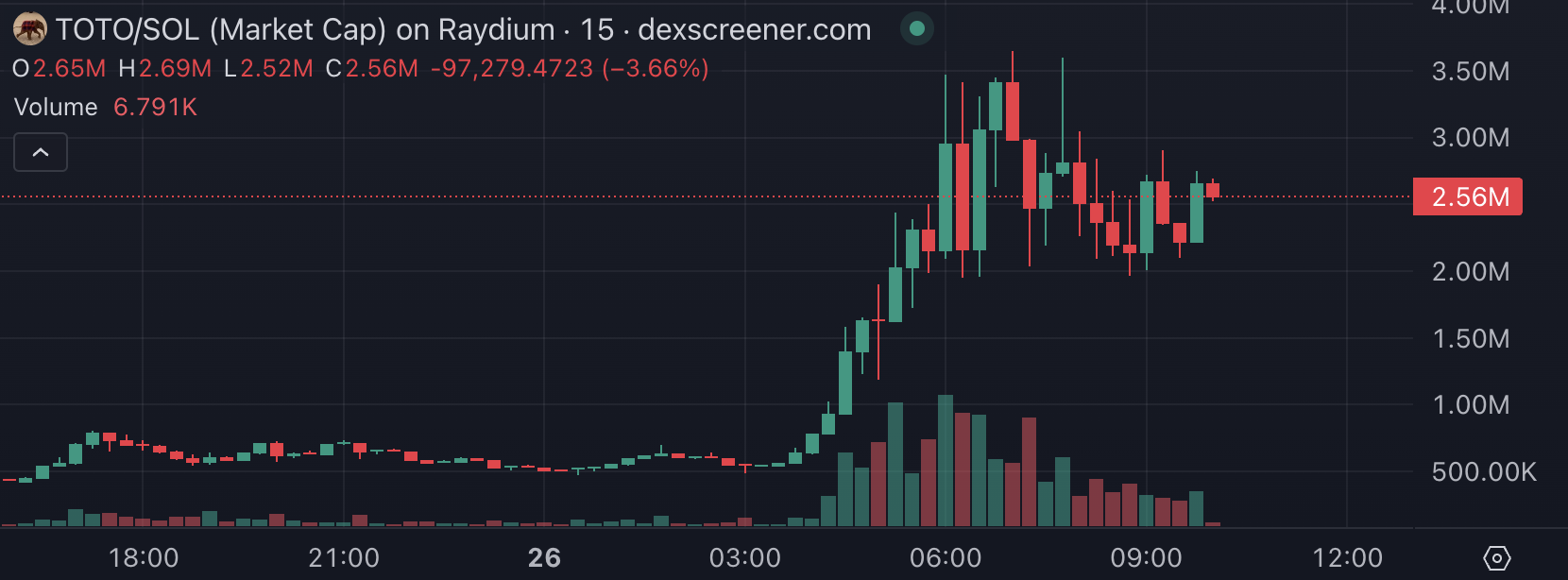 TOTO 是一只被慈善动物保护信托基金 SheldrickTrust 所救助的小象,马斯克曾在 8 月 11 日回复过 TOTO 被救助的推文,TOTO 代币上线于 19 日,市值在突破 1M 美元后持续下跌,昨日晚,TOTO 的救助组织 Sheldrick Wildlife Trust 发布了 TOTO 回顾视频,meme 社区的 TOTO 喊单也密集出现,三个小时后,TOTO 开启暴涨。