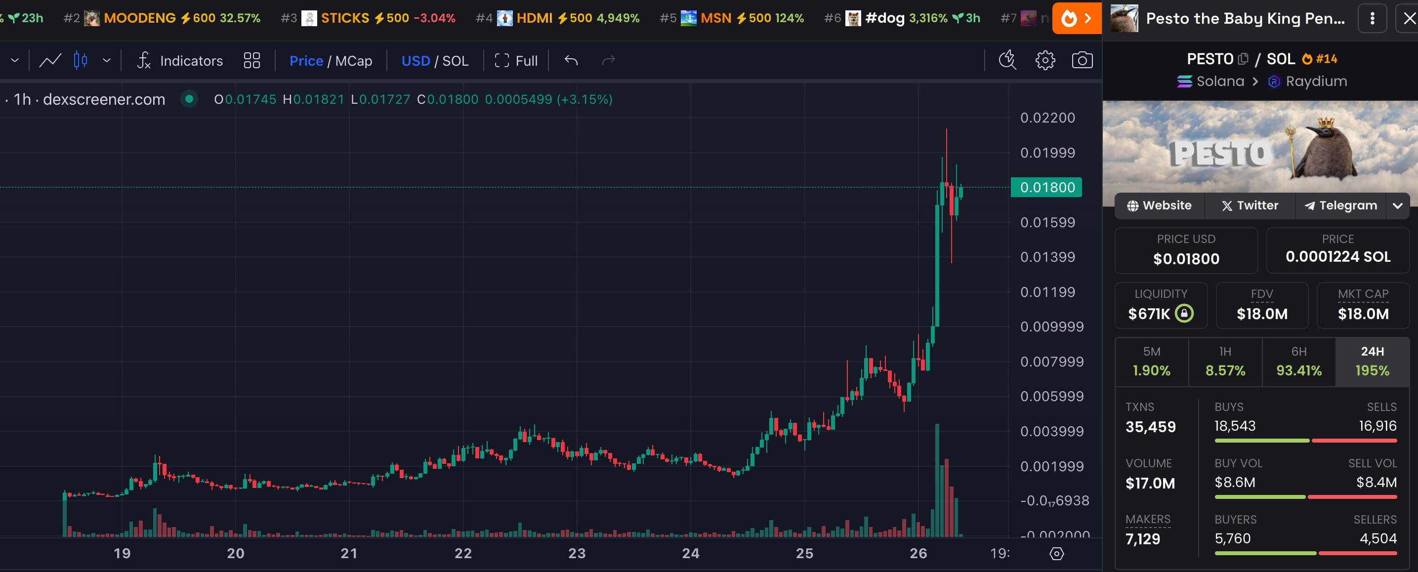 $PESTO 是一只来自澳大利亚的萌物巨型帝企鹅 Pesto,Pesto 在 Web2 的火热程度直追河马 Moodeng,MOODENG 引起 meme 社区注意后,PESTO 也成为了「龙二」标的,Solana 上的$PESTO 上线于 9 月 18 日,表现强势。上线后涨幅超 8 倍。之后的一天遭遇大幅回调,日跌幅超 80%,市值跌破一百万美元。昨日晚间,PESTO 开始拉盘,至今日上午涨幅超 300%。
