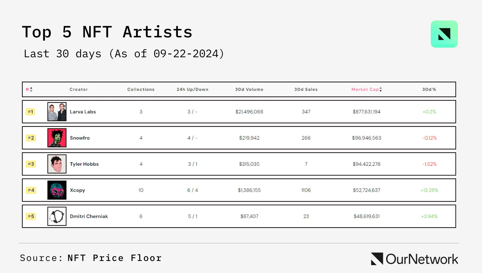 在上个月的前30笔销售中——不包括 1-of-1 类型——有23个出自 Larva Labs,Dmitri Cherniak 和 Tyler Hobbs 各占1个。这两位艺术家在 1-of-1 收藏领域中经常是顶级卖家。根据 NFT Price Floor 的艺术家排名,该排名按艺术家收藏的市值进行排序,XCOPY 这位 NFT 艺术家以市值增长13%而脱颖而出,跻身前四名。