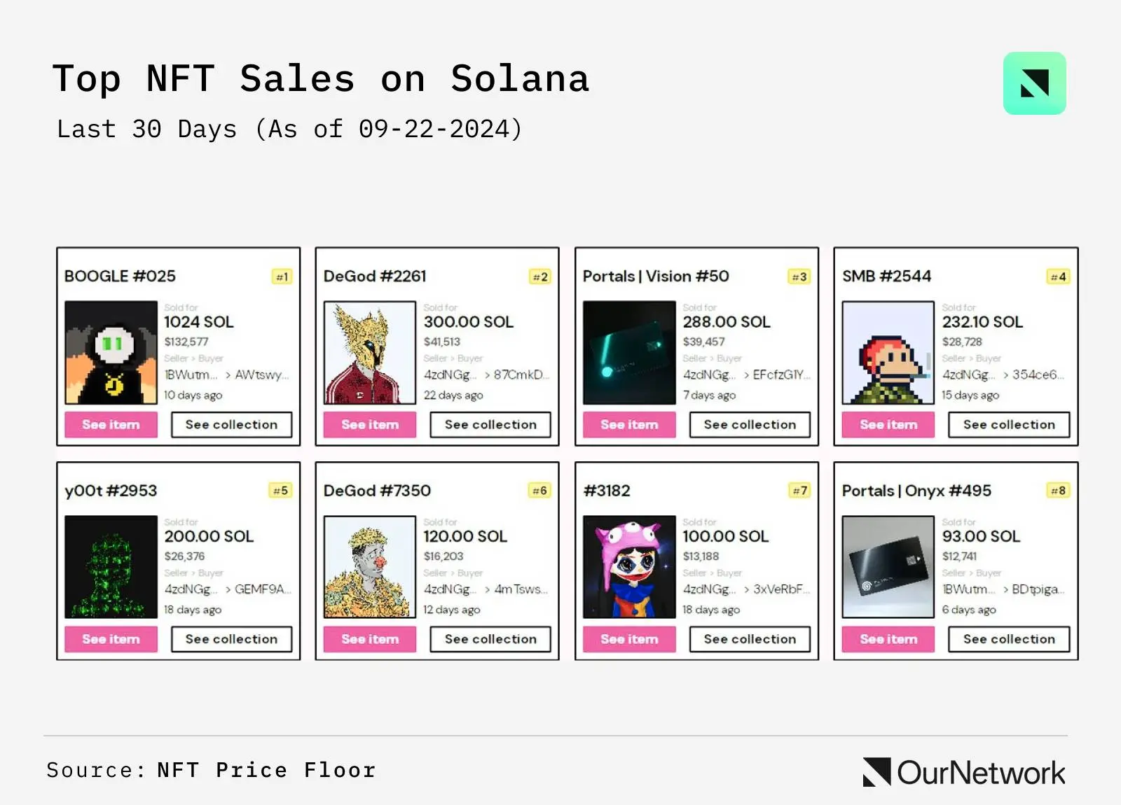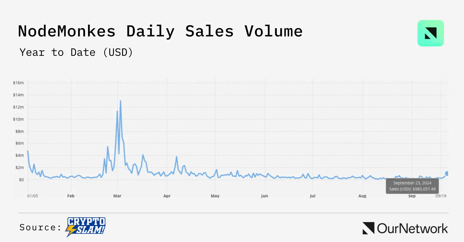 不仅底价处于局部高点,交易量也是如此。NodeMonkes 在 9 月 23 日的单日交易量达到近 100 万美元,具体为 983,057 美元。这是自 6 月 28 日以来的单日最高,几乎是 3 个月来的最高记录。