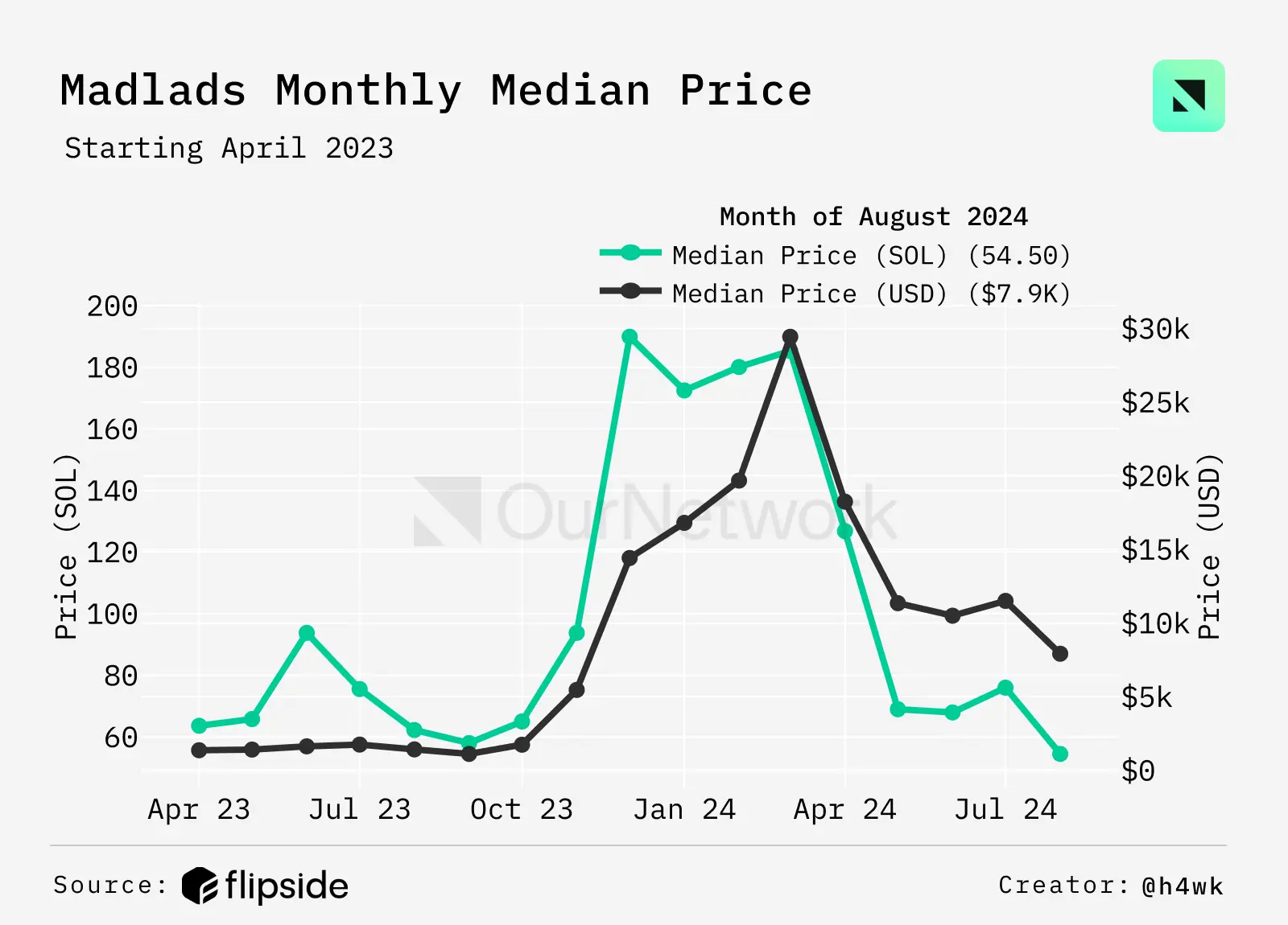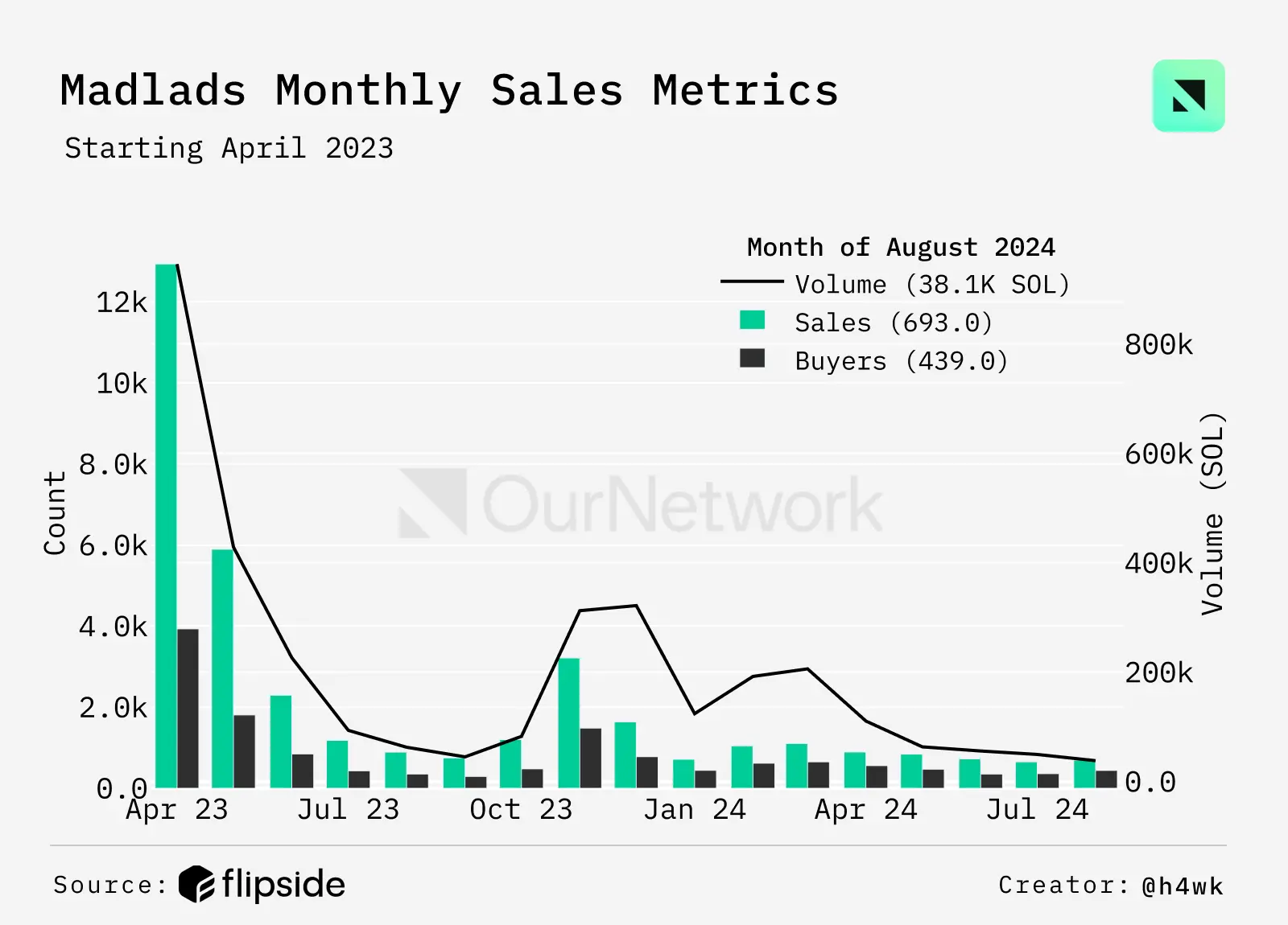 在 Mad Lads 于 2023 年 4 月发布后的第一个月中,有 3,900 名买家推动了 946,000 SOL 的交易量,按当前价格计算约为 1.37 亿美元。从 2023 年中期开始,Mad Lads 的价格从接近 100 SOL 的高点下滑,但在 2024 年 3 月回升至中位价 185 SOL(当时约为 $29,440),随后在 2024 年 8 月降至并稳定在 61 SOL(约 $8,200)。目前,Mad Lads 的价格是其第一个月价格的 6.25 倍(以美元计)。
