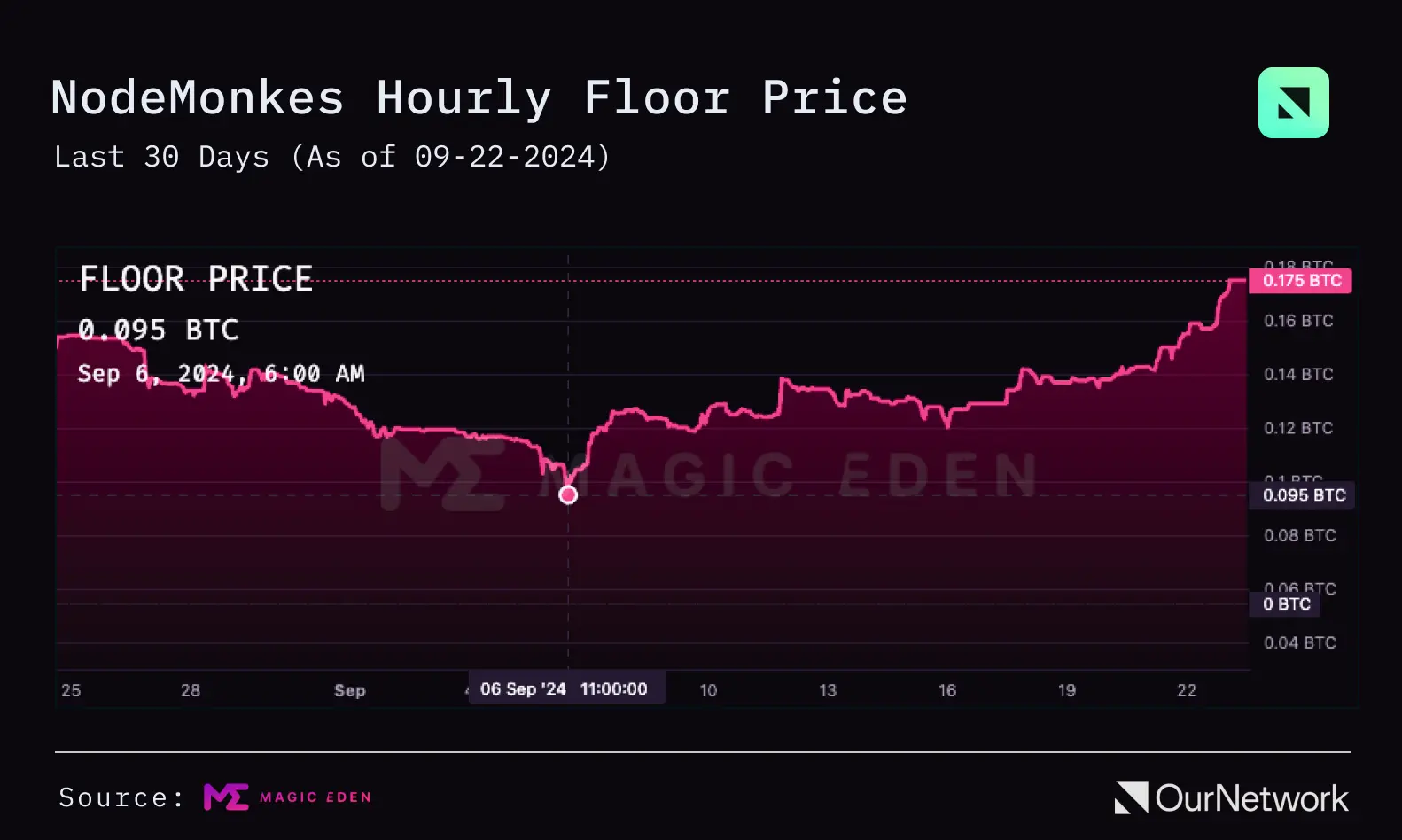 夏季对 Ordinals 来说是不景气的,领先的收藏经历了 70% 甚至超过 80% 的下跌。然而,有迹象表明底部可能已经形成——NodeMonkes 在 Ordinals 中引领了一轮反弹,目前从 9 月 6 日的 0.095 BTC 的局部低点上涨了 94%。它们现在的价格为 0.18 BTC,这是自 6 月 20 日以来的最高水平——有效地弥补了整个夏季的下跌。