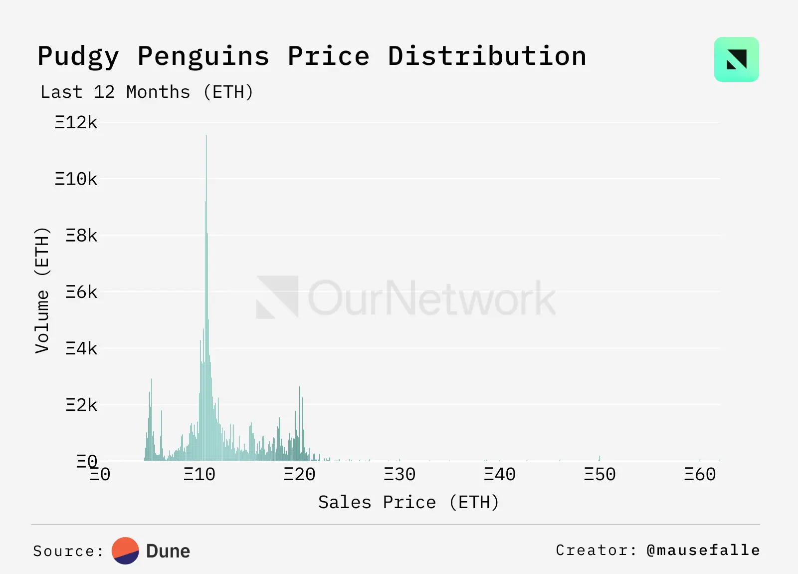 在过去的 12 个月中,在 10 ETH 的价格点发生了大量销售,表明市场对 Pudgys 当前底价的强烈共识。此外,5.9 ETH 和 19.9 ETH 附近也出现了小幅波动,显示出次级价格集中。