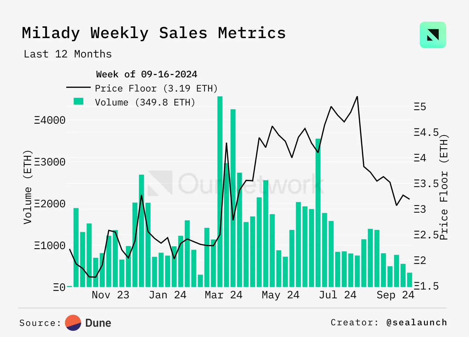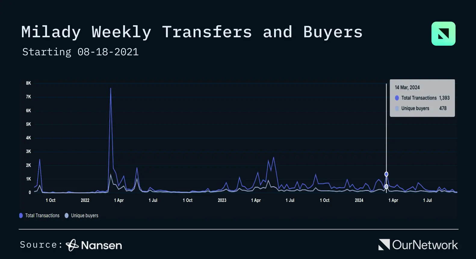 自年初达到峰值以来,Milady 的交易量和独立买家数量持续下降。然而,Remilia 生态系统代币 $CULT 在预售期间筹集了 2000 万美元,这可能会激活交易活动和兴趣——每个 Milady 都有资格获得价值约为 2300 USDT 的空投。