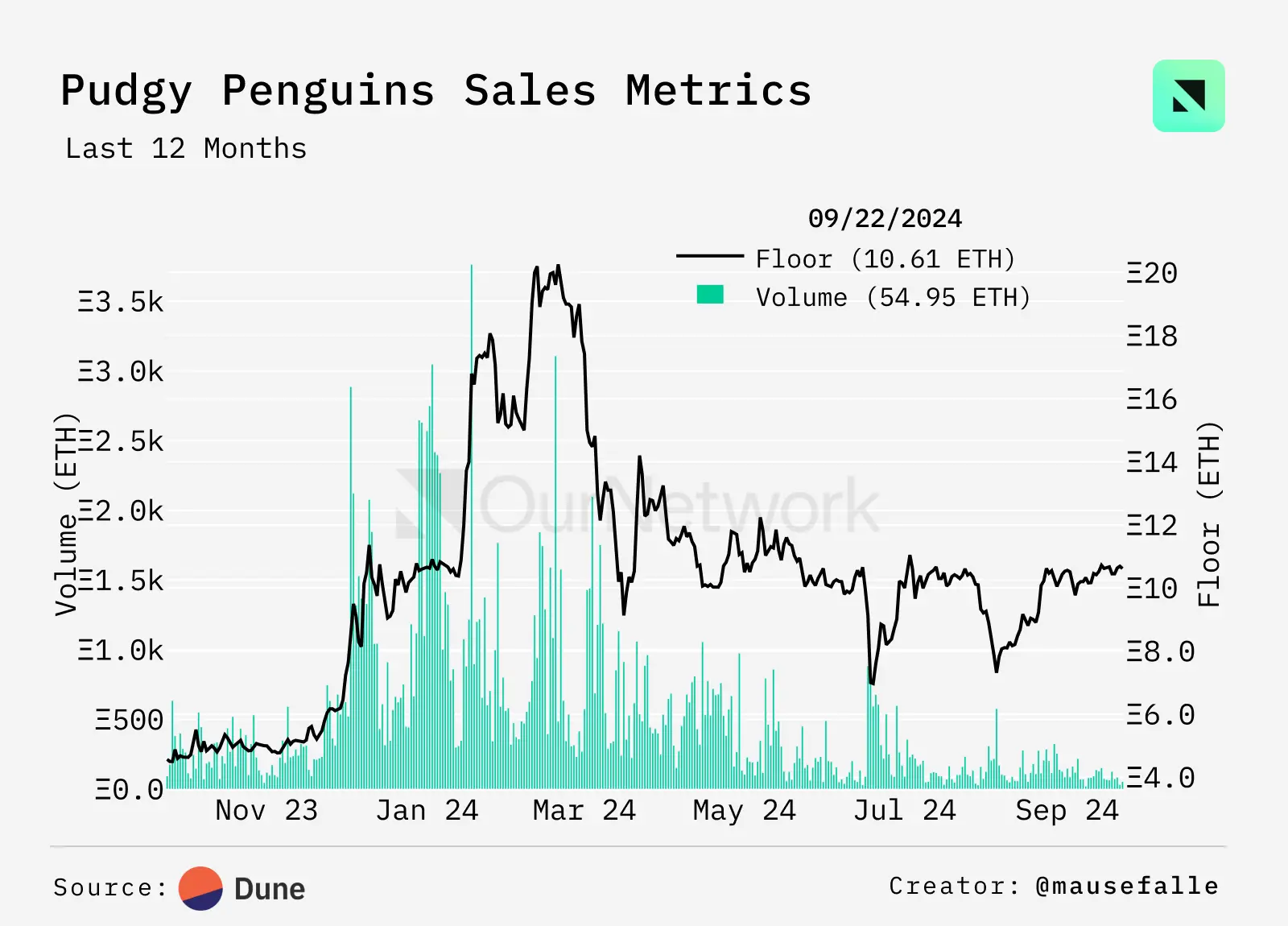 Pudgy Penguins 目前是所有链上市值第三大 NFT 收藏。自 2021 年 7 月上线以来,Pudgys 持续扩大市场份额,自 2023 年 12 月以来,始终占据以 ETH 计价的 NFT 交易量的 5% 到 15%。这与 20 ETH 的价格峰值相对应,随后出现了下跌。自 2024 年 4 月以来,Pudgys 的最低价一直徘徊在 10 ETH 左右,这在距离历史最高价的百分比上显著更高于其他“蓝筹” NFT 收藏。