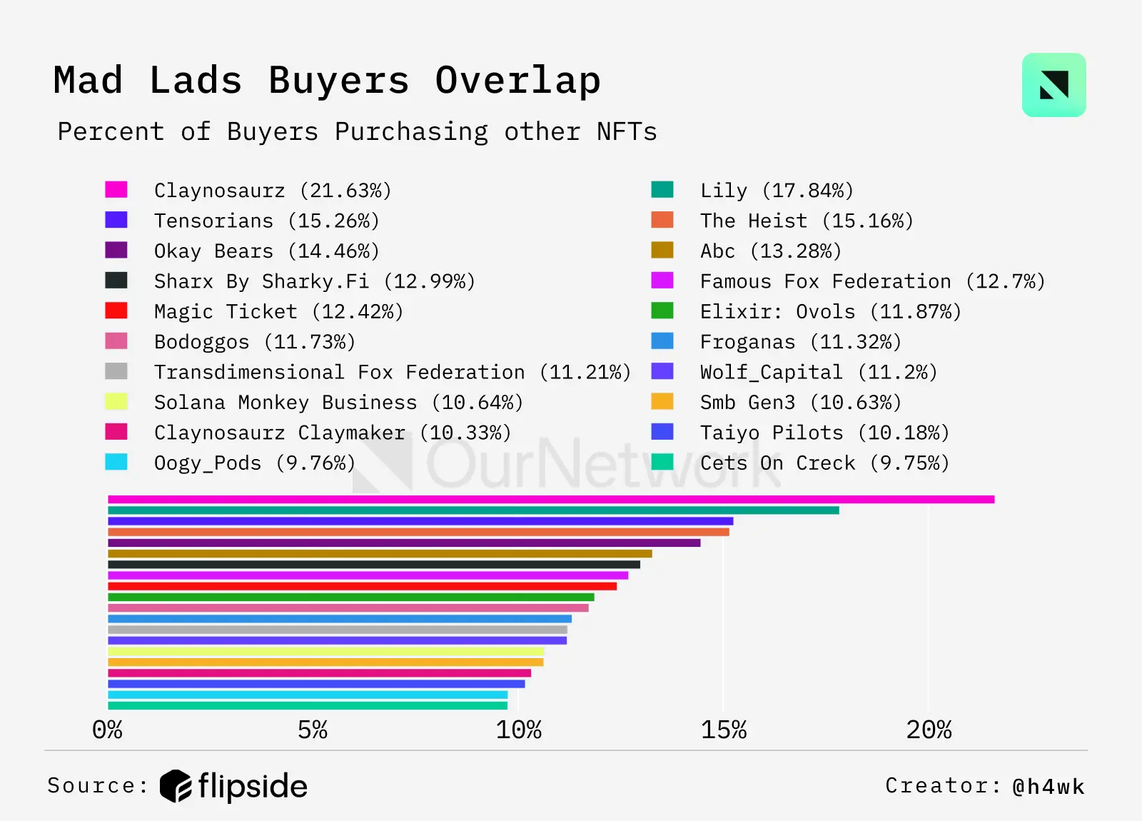 分析 Mad Lads 持有者的其他 NFT 收藏时,可以发现 Claynosaurz 收藏的重叠率达到 21.67%。其他 notable 的交集包括 Lily、Tensorians、The Heist 和 Okay Bears,它们的重叠率在 14% 至 18% 之间。