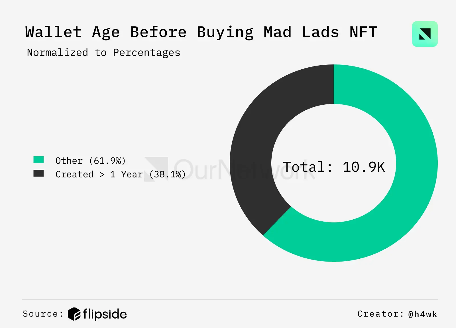 38% 的 Mad Lads 持有者是在购买 NFT 之前就创建的钱包进行购买的——这表明,Mad Lads 的购买中有相当大的一部分来自长期的 Solana 用户,显示出他们对网络的忠诚和深度参与。