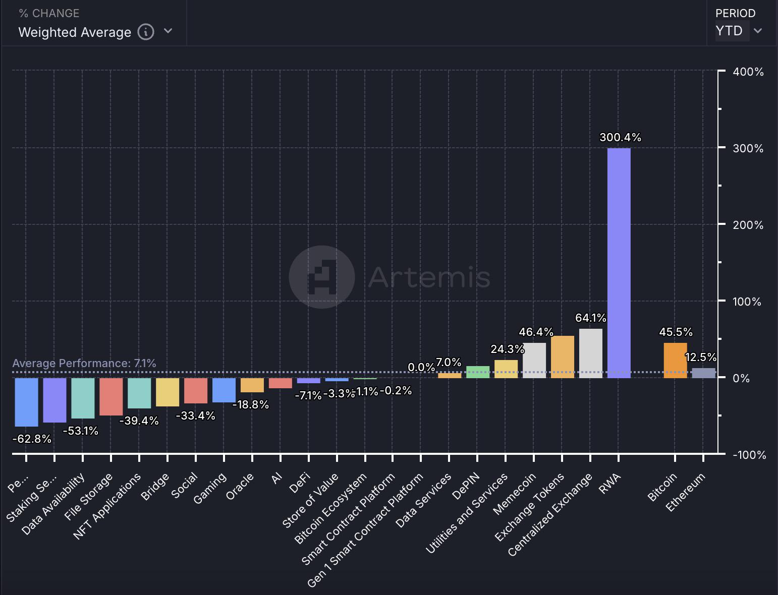 不仅如此,RWA 赛道整体规模的攀升速度也着实让人惊叹。根据 Artemis 数据显示,今年年初至今,RWA 市值规模以高达 301% 的增长率排名首位,远超 MEME、AI、DeFi、DePIN 等热门赛道。