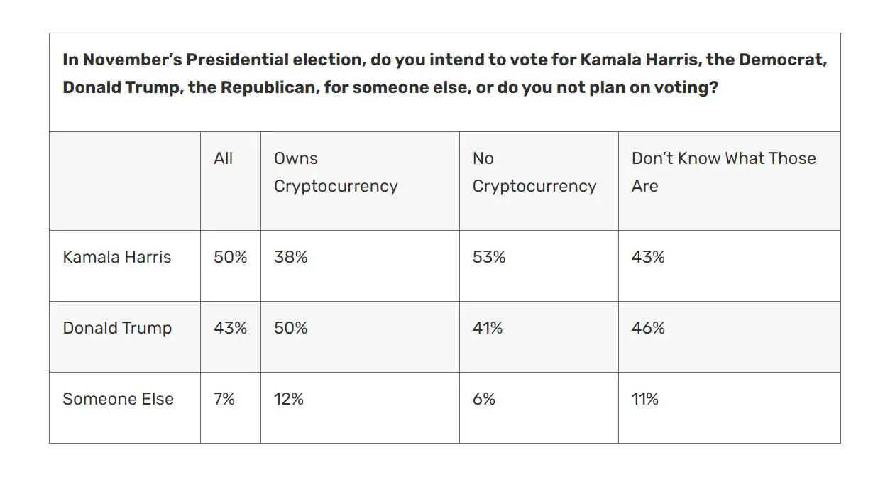 根据费尔利迪金森大学在 8 月 17 日至 20 日进行的全国民调结果,整体上支持哈里斯的选民占比 50%,支持特朗普的为 43%。但是,在拥有加密货币的潜在选民中,特朗普领先 12 个百分点(50% 对 38%),而在声称不拥有加密货币的选民中,哈里斯则领先 12 个百分点(53% 对 41%)。