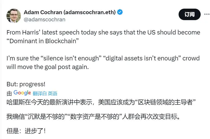 另一方面,部分加密货币倡导者认为,哈里斯在新兴技术方面的立场已经取得了进展。分析师 Adam Cochran 表示,尽管反对者对哈里斯的沉默和「模糊态度」感到不满,但目前的情况仍然代表着一种进步。