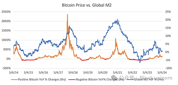 同样,比较比特币和全球流动性的同比百分比变化,也凸显出两者似乎是同步变动的,当流动性增加时,比特币的价格上涨,当流动性下降时,比特币的价格下跌。