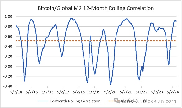 从 12 个月的滚动相关性来看,比特币与全球流动性的平均相关性下降至 0.51。这仍然是一个中等偏正的关系,但显著低于整体相关性。
