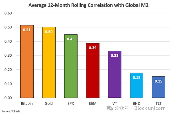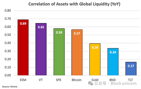 为了更好地理解比特币与全球流动性的相关性,我们将其与其他资产进行了比较,包括 SPDR 标普 500 ETF(SPX)、Vanguard 全球股票 ETF(VT)、iShares MSCI 新兴市场 ETF(EEM)、iShares 20年以上国债ETF(TLT)、Vanguard 总债券市场 ETF(BND)和黄金。