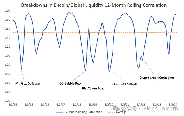 回顾比特币与全球流动性之间的 12 个月滚动相关性减弱的历史实例,可以清楚地看到,比特币的价格往往在重大行业事件发生时与流动性趋势脱钩。