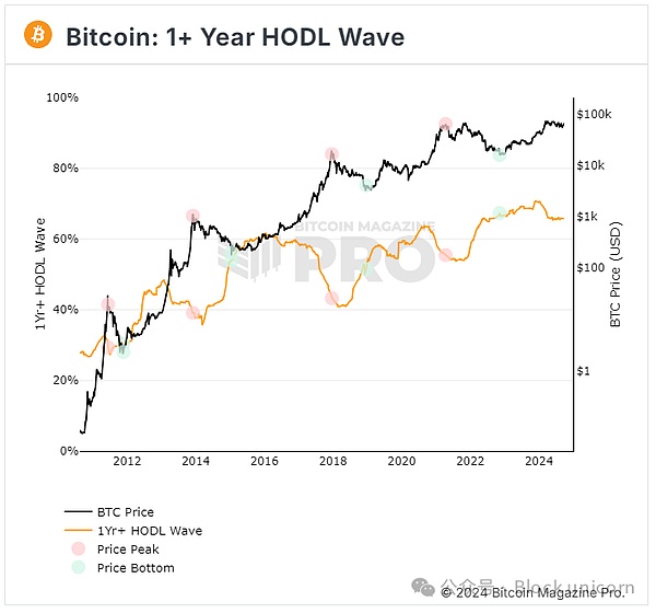 从历史上看,这一指标在牛市期间会下降,因为长期持有者会抛售;在熊市期间,长期持有者会增持,这一指标会上升。下图强调了这种行为,红色圆圈表示周期高峰,绿色圆圈表示底部。