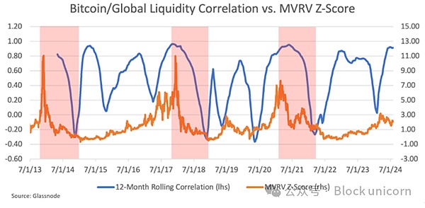 当 MVRV Z 分数与比特币与全球流动性之间的 12 个月滚动相关性重叠时,一种模式开始显现。当 MVRV Z 分数从历史高位急剧下降时,12 个月滚动相关性似乎会失效。下方的红色矩形框突显了这些时间段。