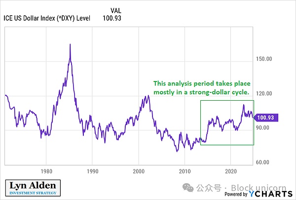 在分析这些相关性的期间,美元处于强势美元周期,这给新兴市场经济体带来压力并影响了整个数据集。