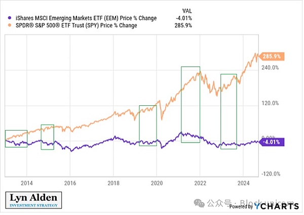 因此,在过去十年中,标普 500 指数的表现优于 EEM,反映了新兴市场在强势美元环境下面临的挑战。