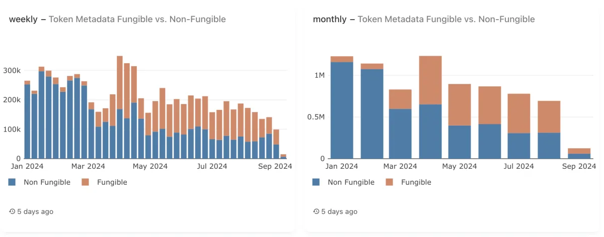 尽管更广泛的 NFT 市场存在波动,Metaplex 作为关键基础设施的作用使其成功扩展至可替代代币领域,证明其实用性远超 NFT。像 Pump.fun 这样的平台越来越多地采用 Metaplex 的 Token Metadata 程序,确保了过去三个月 Solana 上铸造的 90% 的代币与 Metaplex 相关联。这拓宽了其应用场景,确立了 Metaplex 作为可替代和不可替代代币创建的基石地位。