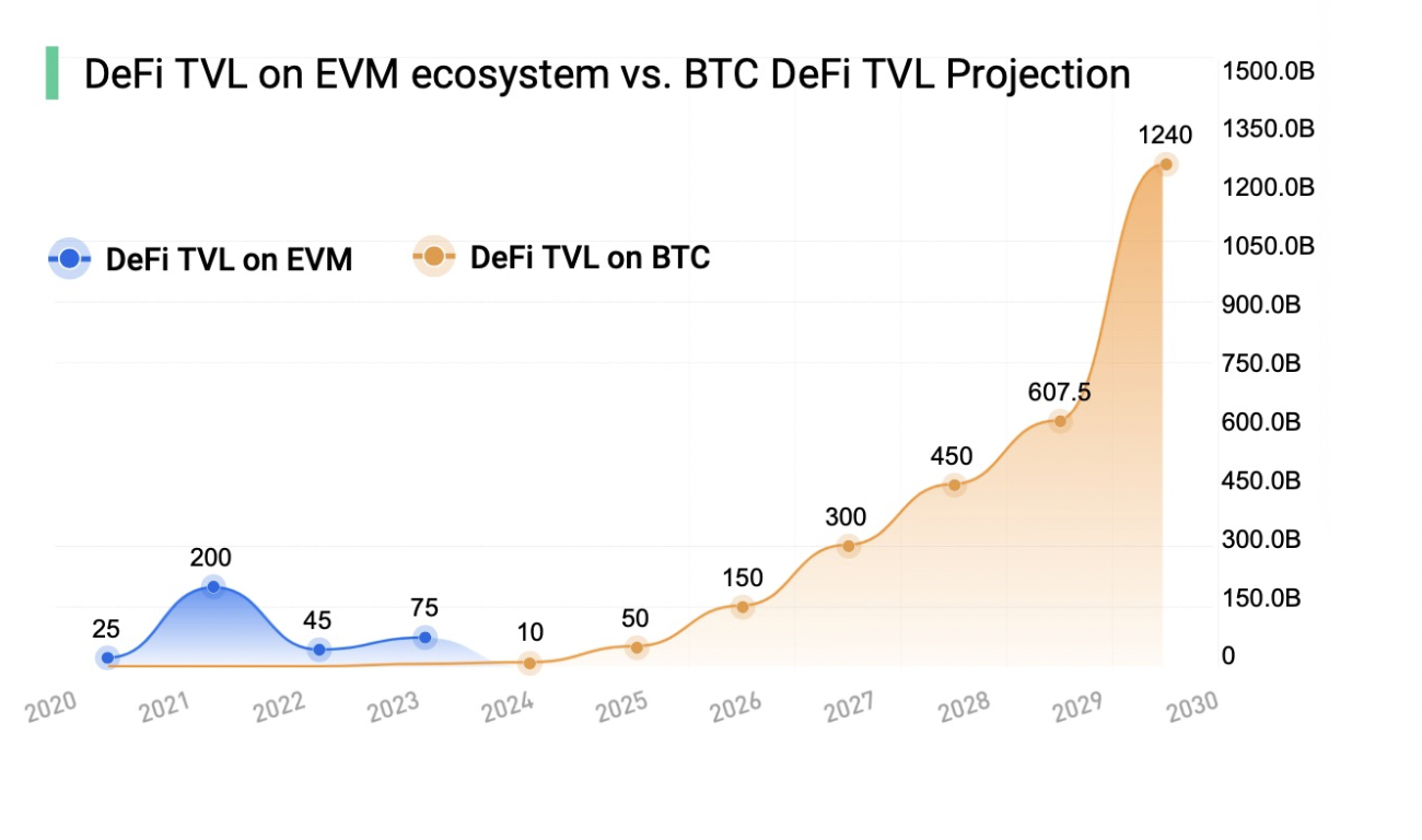 • BTCFi(比特币金融)就像一个移动的比特币银行,是围绕比特币展开的一系列金融活动,包括比特币借贷、质押、交易、期货和衍生品等。根据 CryptoCompare 和 CoinGecko 的数据, 2023 年 BTCFi 市场的规模已经达到了约 100 亿美元。根据 Defilama 的数据预测到 2030 年 BTCFI 的市场会达到 1.2 万亿美金的规模,这一数据包括了比特币在去中心化金融(DeFi)生态系统中的总锁仓量(TVL),以及比特币相关的金融产品和服务的市场规模过去十年,BTCFi 市场更是逐渐显示出了显著的增长潜力,吸引了越来越多的机构参与,例如灰度(Grayscale)、贝莱德(BlackRock)和摩根大通(JPMorgan)开始涉足比特币和 BTCFi 市场。机构投资者的参与不仅带来了大量的资金流入,增加了市场流动性和稳定性,也提升了市场的成熟度和规范性,为 BTCFi 市场带来了更高的认可度和信任度。