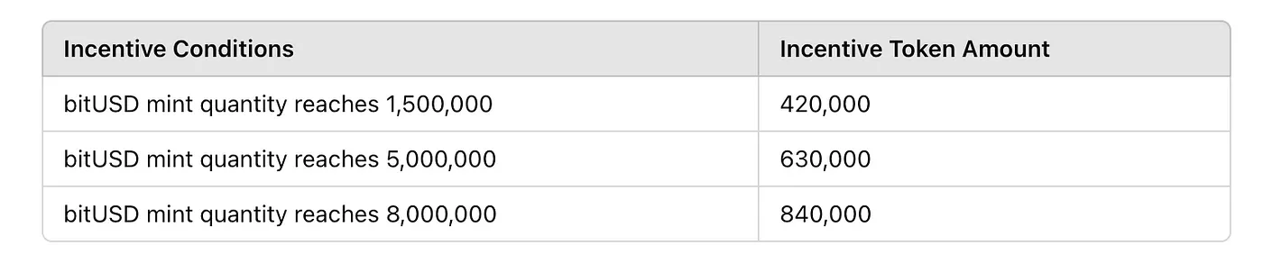 ○ 奖励方式:bitUSD 铸造达到目标以及在 bitCow 上为 bitUSD 池子增加流动性,两种方式激励详情如下图。流动性激励金将根据用户在 Merlin 链上获得的 bitPoints 进行分配,用户获得的积分越多,获得的代币激励就越多。