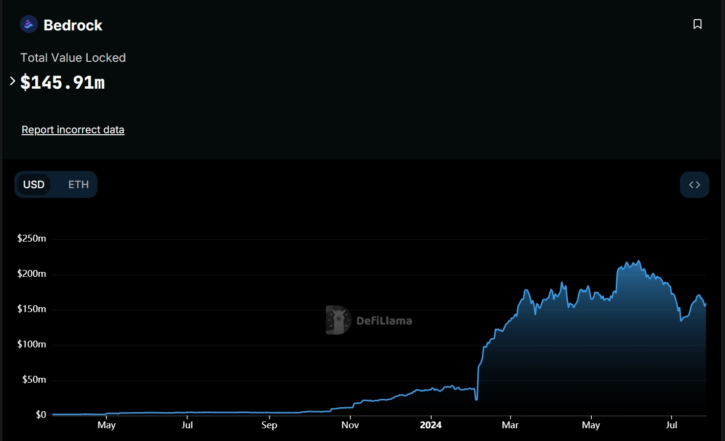 • Bedrock 获得了 OKX Ventures、Waterdrip Capital、Amber Group 等著名机构的投资。2024 年 5 月 2 日,OKX Ventures 宣布领投 Bedrock。OKX Ventures 创始人 Dora Yue 表示:「DeFi 如火如荼的发展下, 链上质押总值已超 934 亿美金,其中 48% 来自流动性再质押板块。对 Bedrock 的投资旨在加速流动性再质押解决方案。我们希望为社区用户提供多元化和安全的资产管理选择。期待 DeFi 使用场景逐步成熟化和体系化,促进 Web3 行业的可持续性发展」。