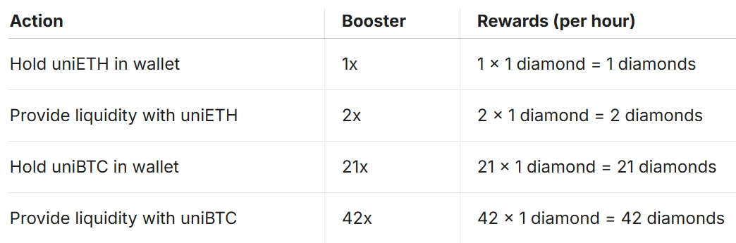 • 2024 年 8 月 1 日至 8 月 7 日,Bedrock 与币安联合启动质押活动。从 8 月 1 日开始,用户只需将 uniBTC 持有在钱包中,每小时每个代币将获得 21 倍的 Bedrock 钻石奖励,对于币安 Web3 钱包用户还会再获得 3 倍提升。