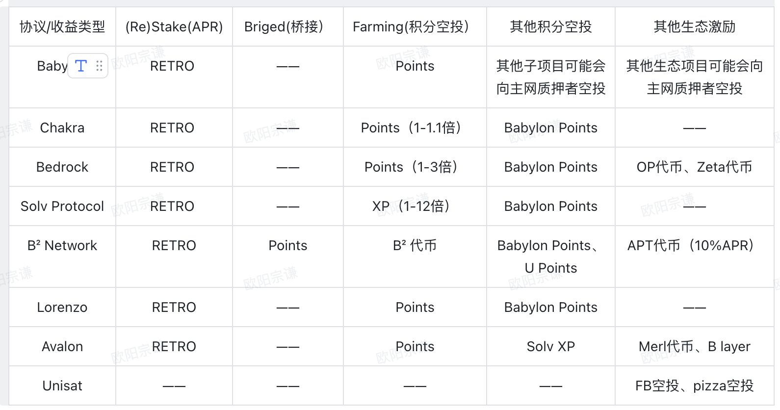 注:表格中的 RETRO 指因为 Babylon 的 APR 还没有被统计,而其他项目的 APR 又取决于 Babylon,这里不进行估计。除此之外,币安、OKX、HTX 等均与 Babylon、Chakra、Bedrock、B² 、Solv Protocol 等合作开展了一系列预质押、farming 等活动,用户已经取得了很高的收益,特别是币安 web3 钱包的一系列质押活动。