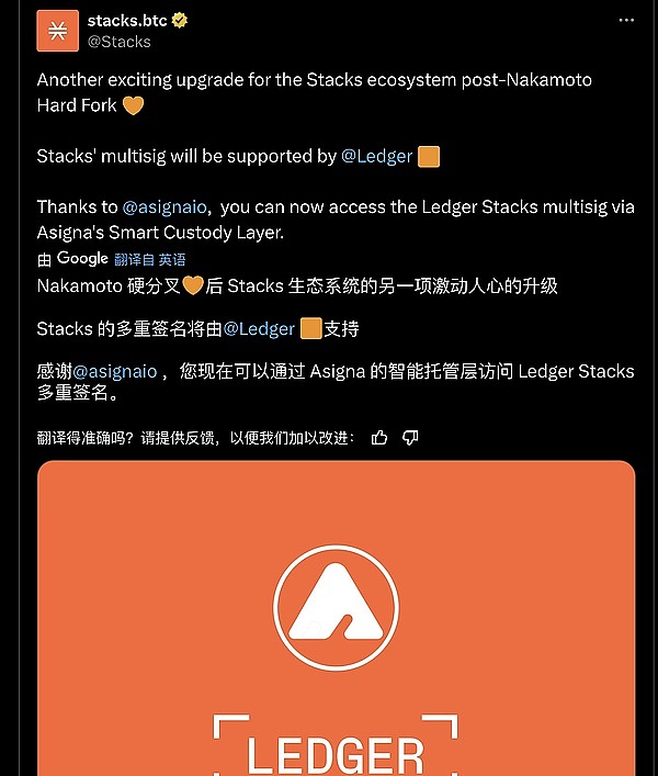 ● Nakamoto 硬分叉后 Stacks 生态系统的另一项激动人心的升级,Stacks 的多重签名将由 @Ledger 支持!感谢 @asignaio,现在你可以通过 Asigna 的智能托管层访问 Ledger Stacks 多重签名。