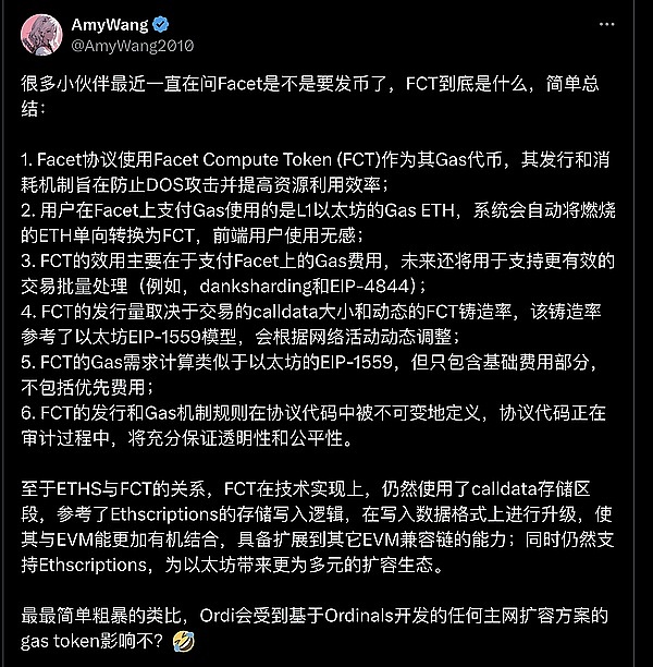 ● 关于以太坊铭文 Facet @ethscriptions @0xFacet 协议发币了?疑问解答? 答案是否定的,Facet 使用 Facet Compute Token (FCT) 作为其 Gas 代币,其发行和消耗机制旨在防止 DOS 攻击并提高资源利用效率。