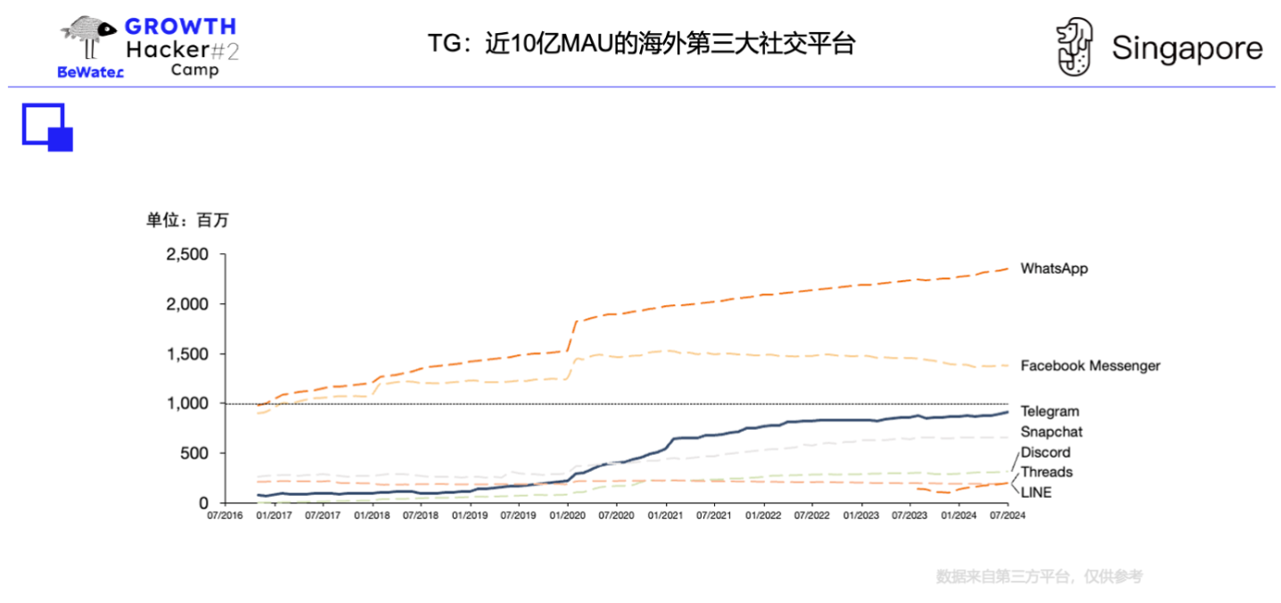 TG 是未来全球绝对增速最快的社交平台,MAU 最新已突破 9.5 亿,是 2.4 亿人口的 CIS 地区的「微信」。现在一个十亿量级的 APP,未来三年 target 达到 15 亿,即 50% 的绝对增速。很难想象微信、抖音还会有 50% 的增速。相比 Top2 的 WhatsApp 与 Facebook Messenger:TG 开放程度更灵活、功能基建更完善、生态闭环更紧密,可对标为海外最接近微信生态的平台。