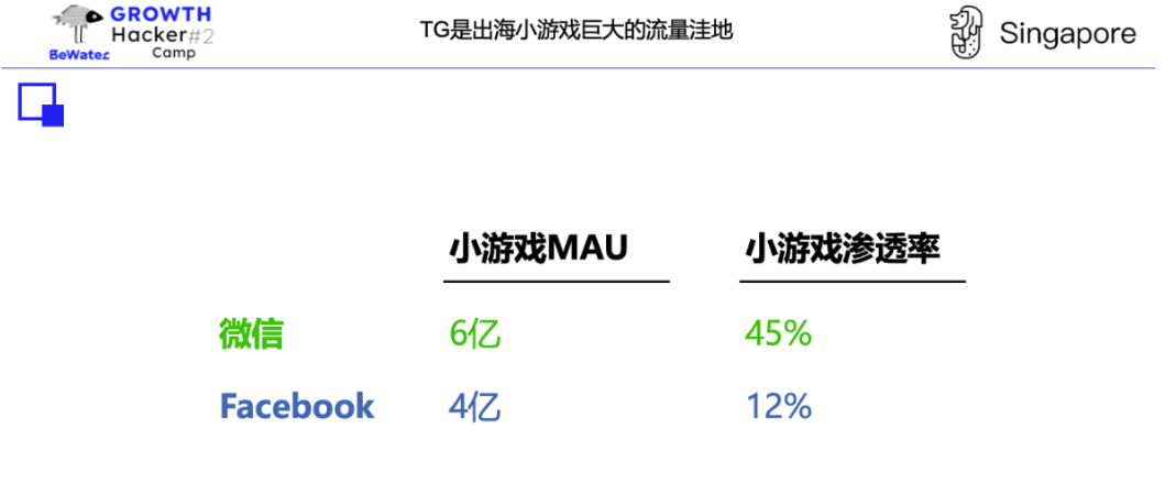 TG 是出海小游戏巨大的流量洼地,未来渗透率、用户或出现戴维斯双击。TG 小游戏形态正在不断进化。大家会觉得现在小游戏很卷了,流量成本也很贵。针对小游戏的发展前景我列出了这张图,渗透率方面,可能微信的 45% 很难到,但我认为可以超过 Facebook 的 12%。