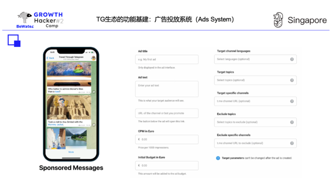 TG 广告系统尚未出现工业化获量方式,因此,TG 也出现了民间广告系统解决数据层的问题。TG 广告系统分为官方和民间的广告系统。目前 TG App center 中仅有编辑人工精选,what's new 功能。此外,Appbar 有个性化推荐,目前官方广告系统广告位只支持公众号图文式插入,投放效果在官方不收集用户信息的情况下目前无法实现精准投放,这与 TG 创始人的产品理念,对 Facebook 通过手机用户信息来实现广告投放的行为并不认同有关。因此,TG 也出现了民间广告系统,正在通过链上数据、群表现等各种形式解决数据层问题。