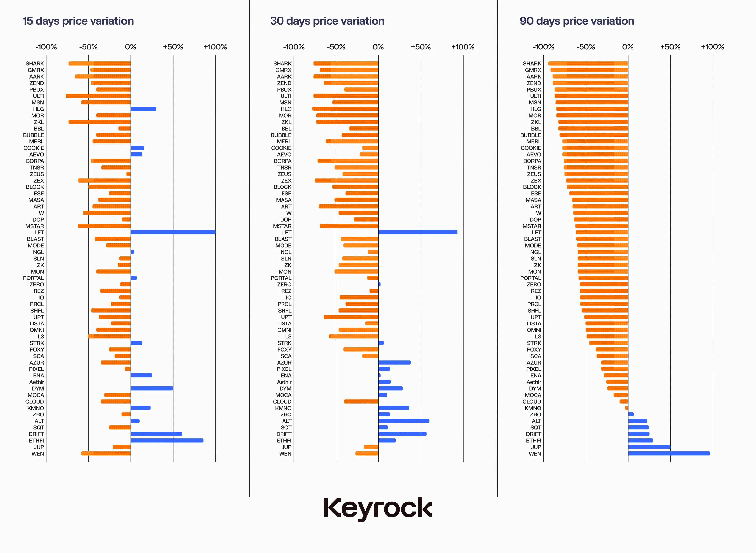 观察15天、30天和90天的价格走势,很明显大部分价格变动发生在空投后的最初几天。三个月后,很少有代币能够实现正收益,只有少数几个逆势上扬。尽管如此,重要的是要考虑更广泛的背景:在这段时间内,整个加密市场的表现并不好,这使得情况更加复杂。