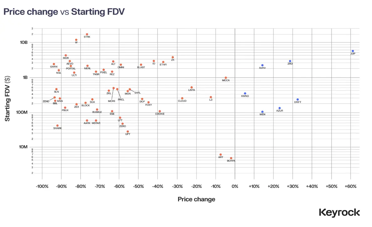数据证实了这一点。FDV较低的代币经历了较少的价格侵蚀,而那些以过高估值启动的代币在空投后的几个月里遭受的损失最大。