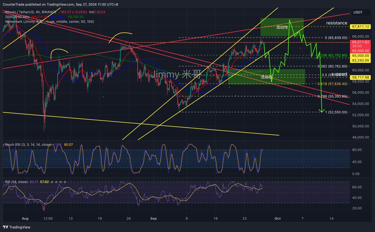@CryptosLaowai 认为 BTC 已经捕捉了 65k+的流动性,这里可能会出现暴跌。BTC 从 53k 以来开启的上涨趋势的形态是上升的扩张楔形,楔形接近尾声会出现方向的选择,大概率会向下,目标是回测 57-59 的支撑,然后捕捉上升趋势线的流动性大概在 68k 的位置随后下跌。