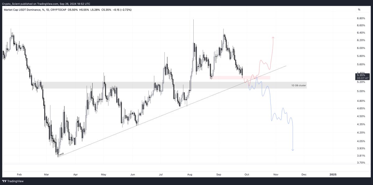 @Crypto_Scient 认为可以用 USDT.D 的走势来推测后续 BTC 的发展:如果 USDT.D 遵循红色路径,在日线流动性聚集区域中抢占流动性,然后回踩上升趋势线后上涨,那么 BTC 会呈现空头走势;如果 USDT.D 遵循蓝色路径,突破趋势,将趋势反转,那么 BTC 会走出多头趋势到达历史新高。现在需要等待观察 USDT.D 走出确切的信号,再决定后续的交易策略