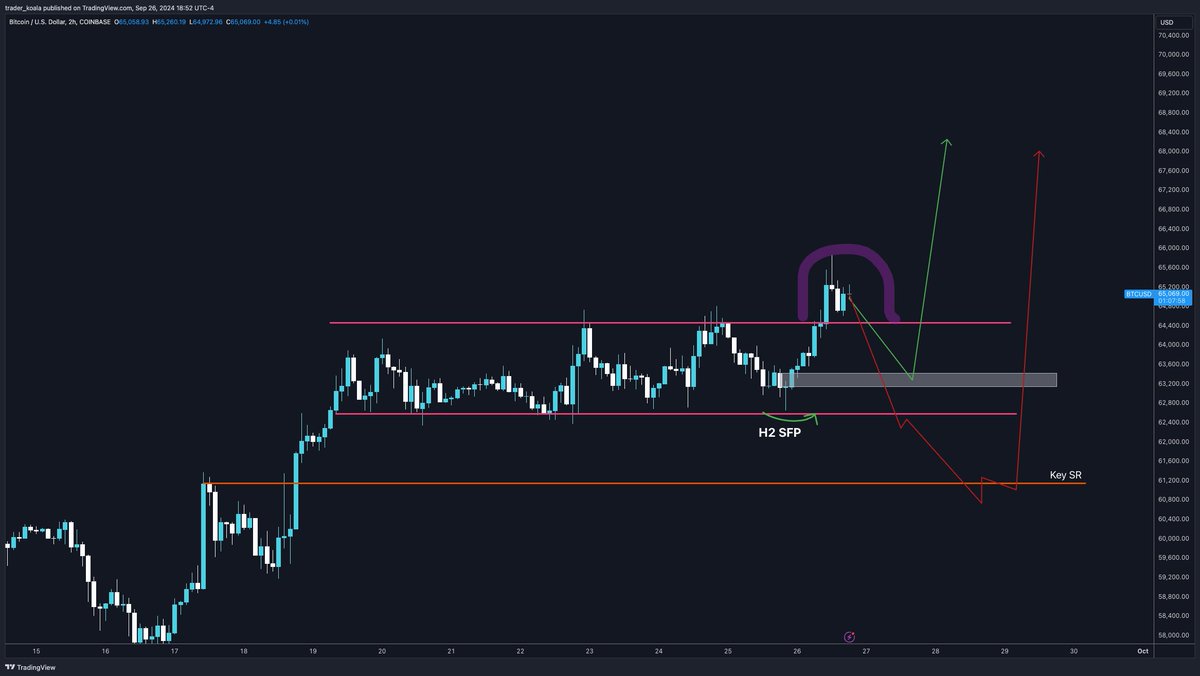 7 月 29 日 BTC 突破 70k 后,开启了一轮下跌趋势,在 8 月 5 日到达 49k 又反弹至 65k 继续下跌在 9 月 6 日在 53k 附近形成了类双底结构后,9 月 19 日美联储确定降息,BTC 顺势上涨。9 月 26 日美盘时段,伴随着美股指数的强势上涨,BTC 已经突破前一轮高点 65k,破坏了更低的低点和更高的高点的结构。