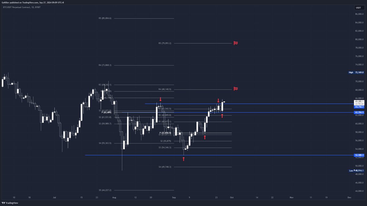 @goukiller 认为在周线级别的博弈中,Pivot Point 的 R3 防守成功,还是处在上涨行情中,后续上涨目标为 R4 68.1k 和 R5 79k。